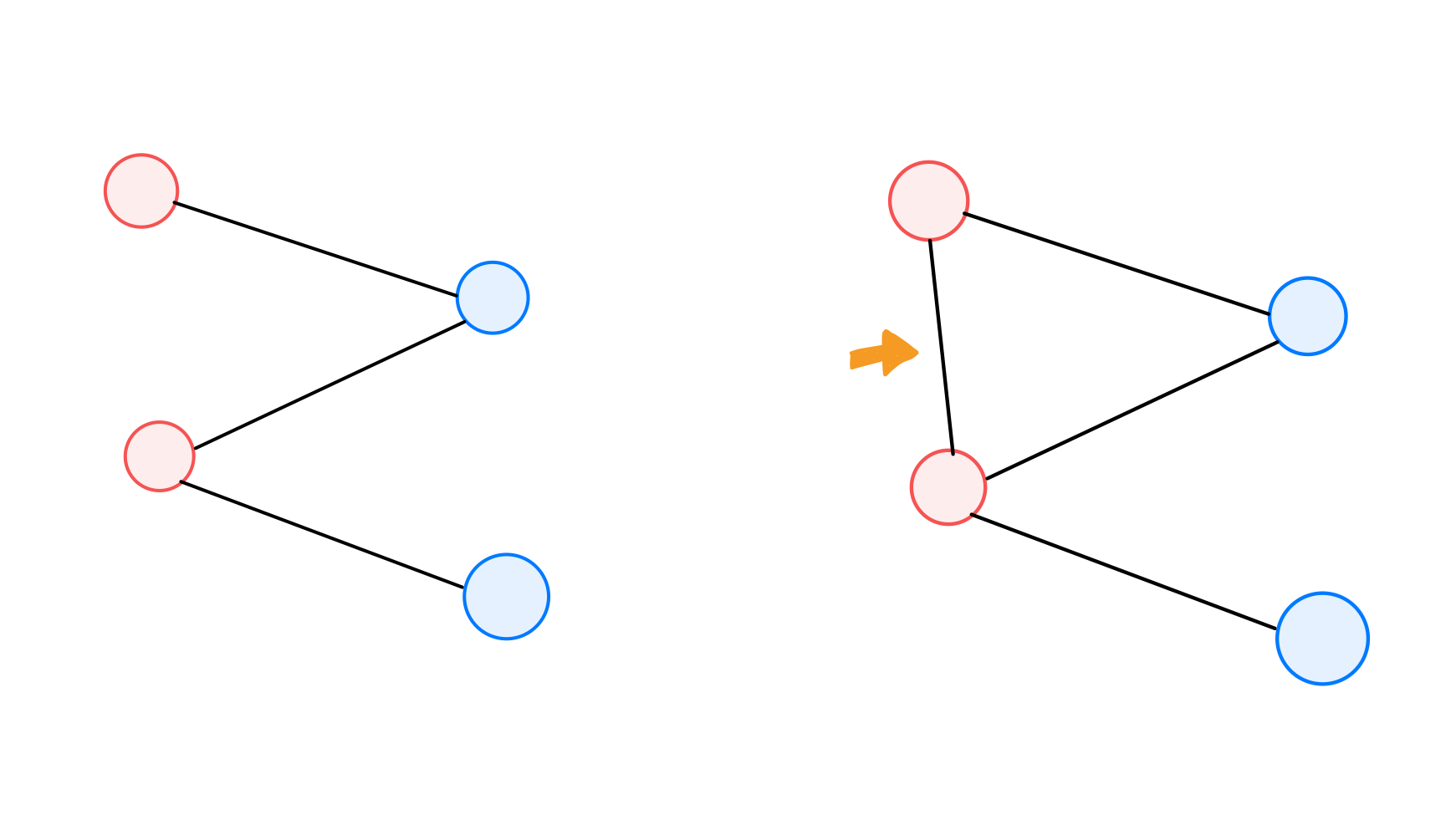 왼쪽 그래프는 한 간선에 빨강, 파랑 점이 하나씩 연결된 반면(이분그래프),